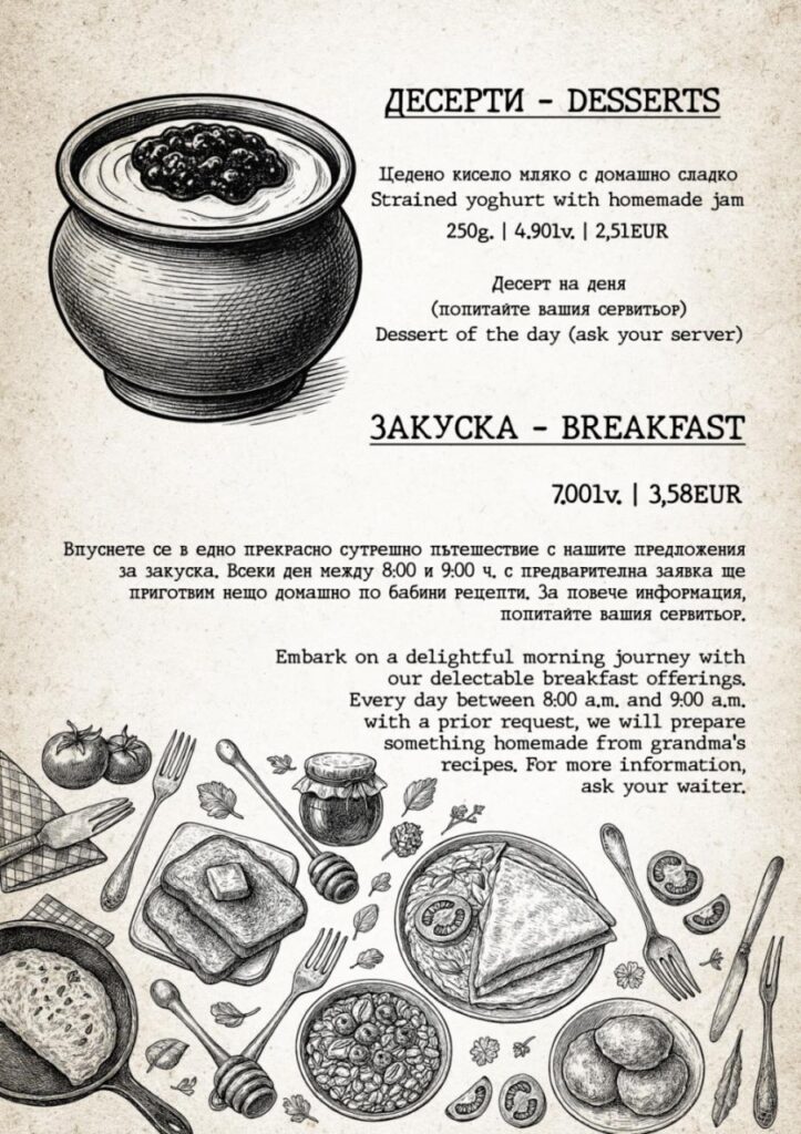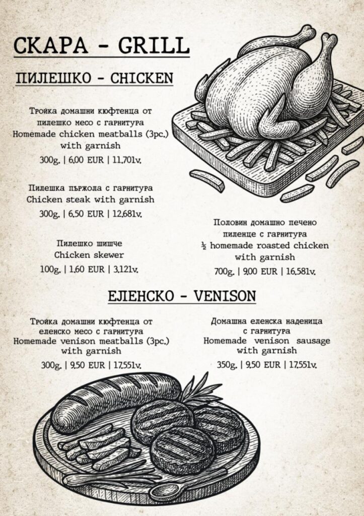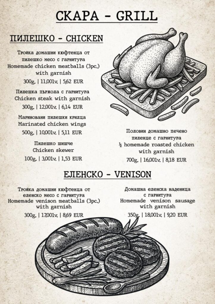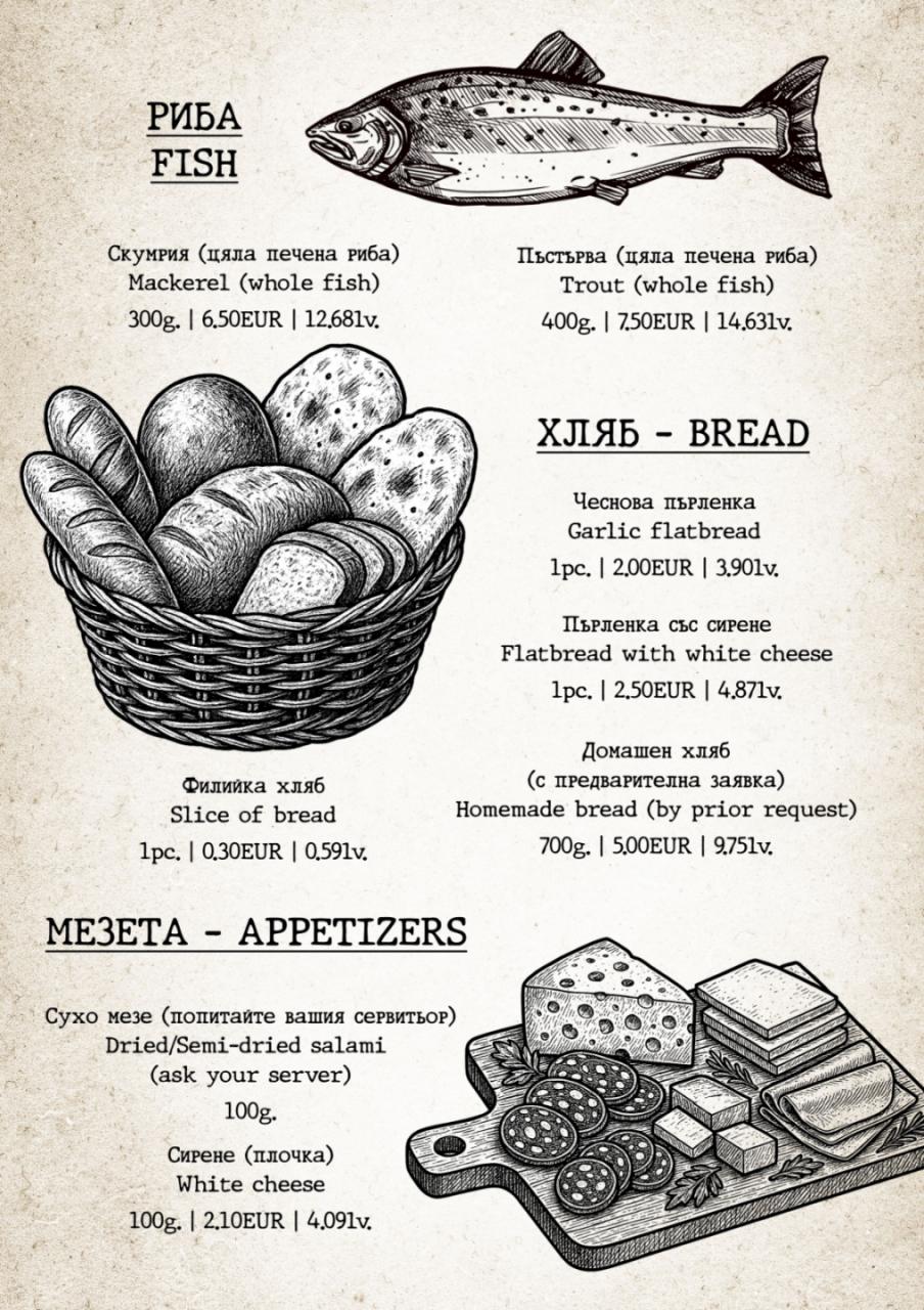 Жарнати на живия огън, поръсени с благи думи, приготвени изкусно от майстор готвач, специалитетите ни са подбрани така, че да погалят небцето ви и да ви върнат назад във времето. Заповядайте на кулинарно пътешествие из българските и странджанските вкусове, вдъхновено от традиционните рецепти на баба. Опитайте истински вкусове от природата!