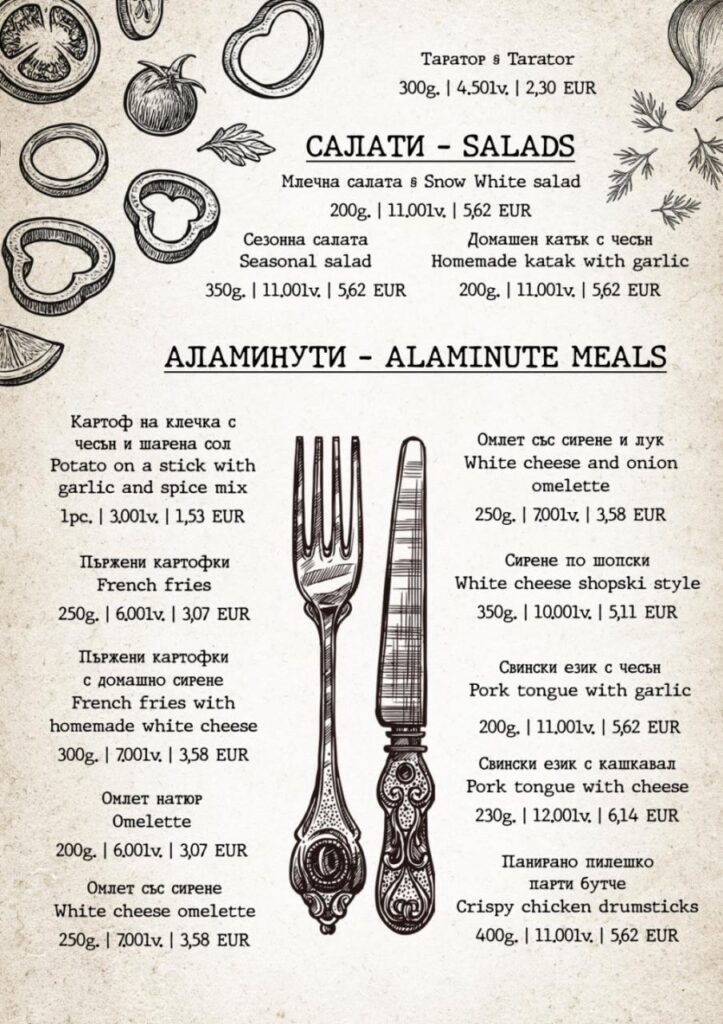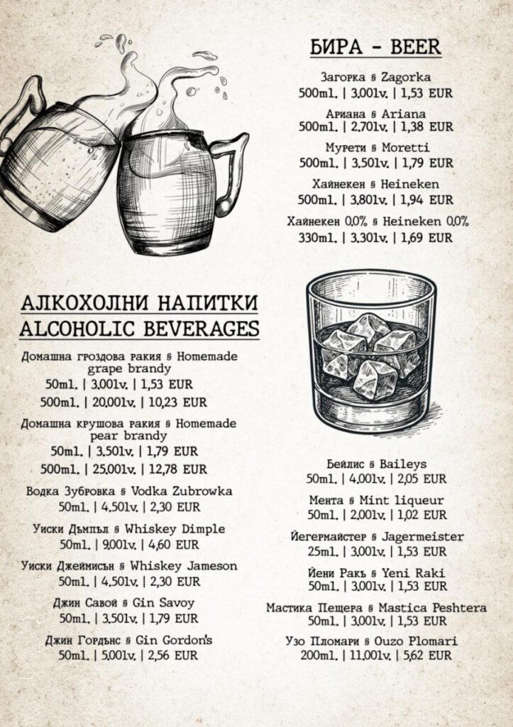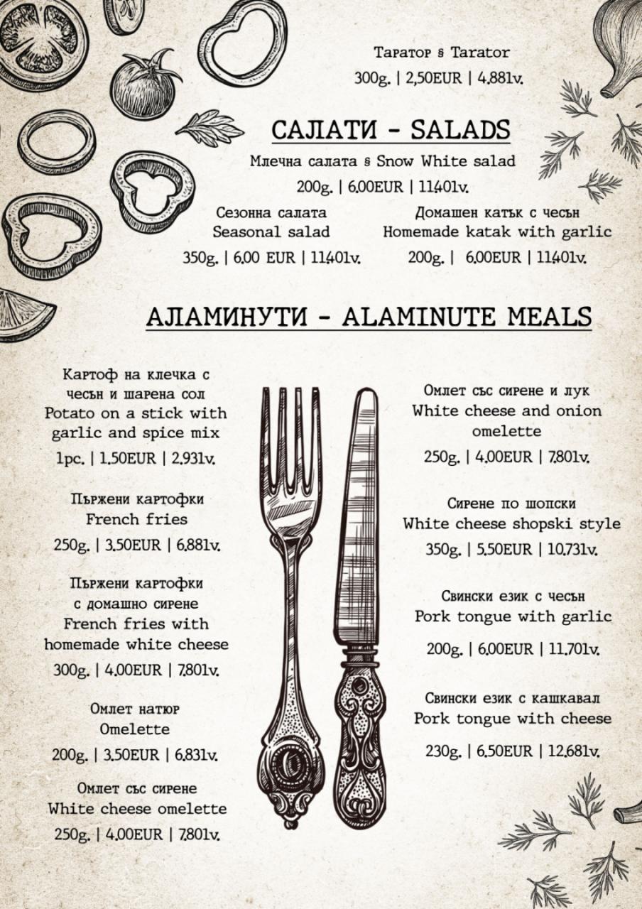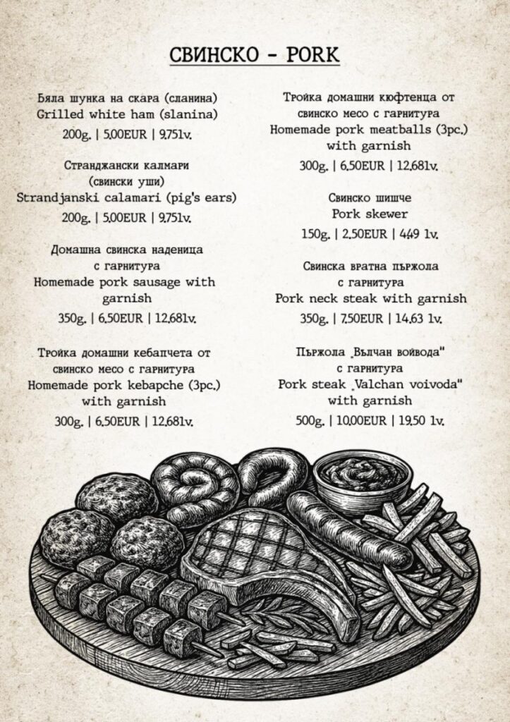Жарнати на живия огън, поръсени с благи думи, приготвени изкусно от майстор готвач, специалитетите ни са подбрани така, че да погалят небцето ви и да ви върнат назад във времето. Заповядайте на кулинарно пътешествие из българските и странджанските вкусове, вдъхновено от традиционните рецепти на баба. Опитайте истински вкусове от природата!